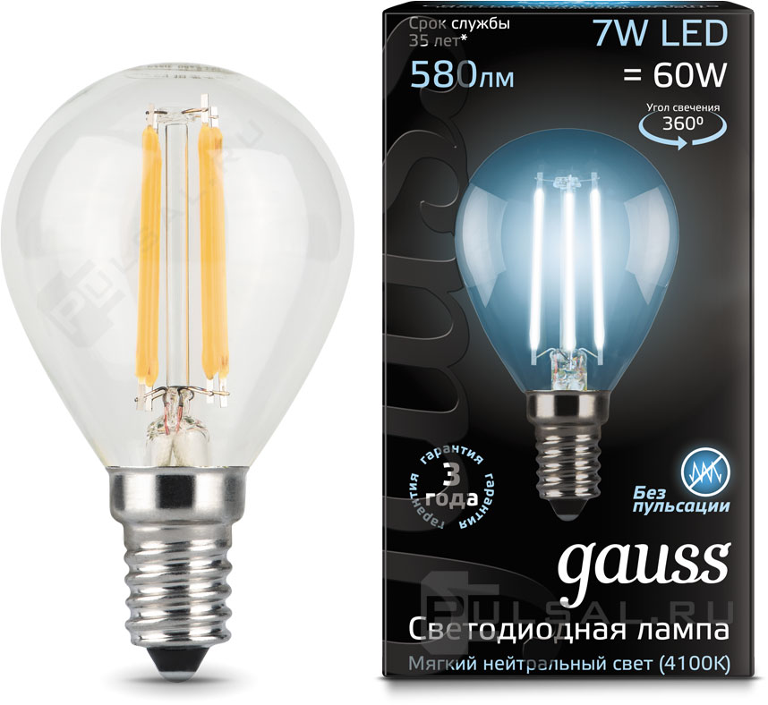 Лампа прозрачная филаментная Black, цоколь - E14, мощность - 7Вт, световой поток - 580Лм, цветовая температура - 4100К, не диммируется, 105801207, Gauss