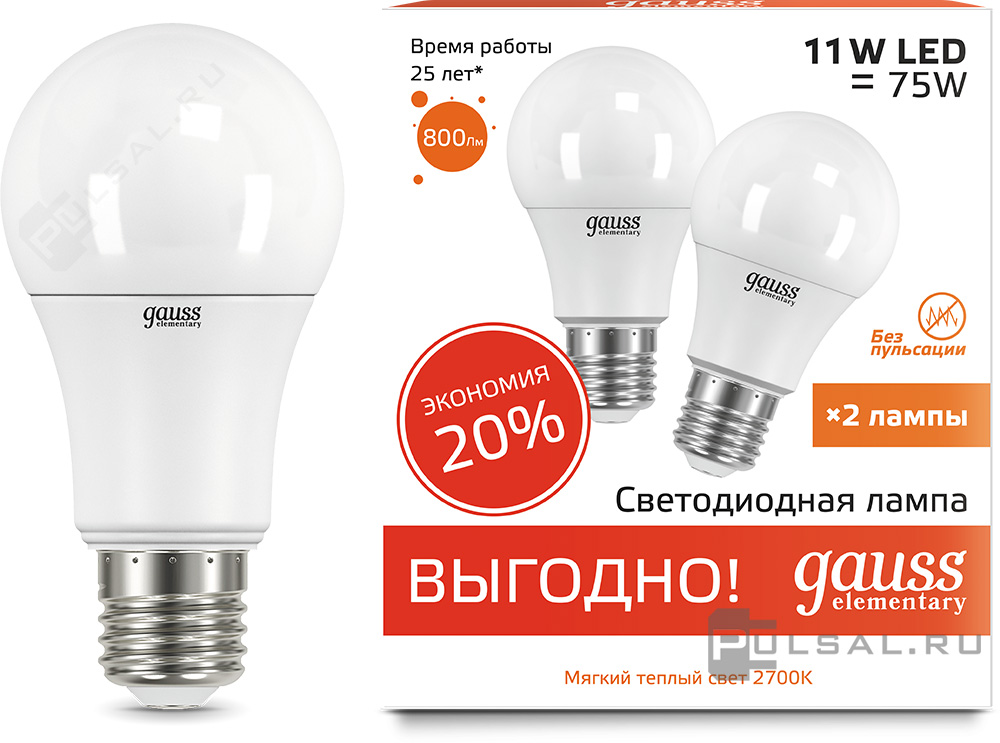 Elementary, цоколь - E27, мощность - 12Вт, световой поток - 1130Лм, цветовая температура - 3000К, не диммируется, 23212, Gauss