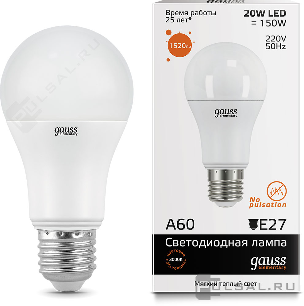 Лампа светодиодная Elementary, цоколь - E27, мощность - 12Вт, световой поток - 1130Лм, цветовая температура - 3000К, не диммируется, 23212, Gauss