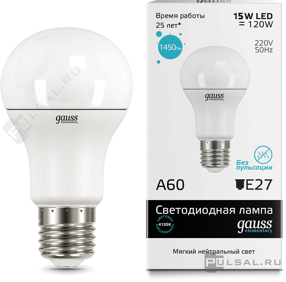 Лампа светодиодная Elementary, цоколь - E27, мощность - 15Вт, световой поток - 1450Лм, цветовая температура - 4100К, не диммируется, 23225, Gauss