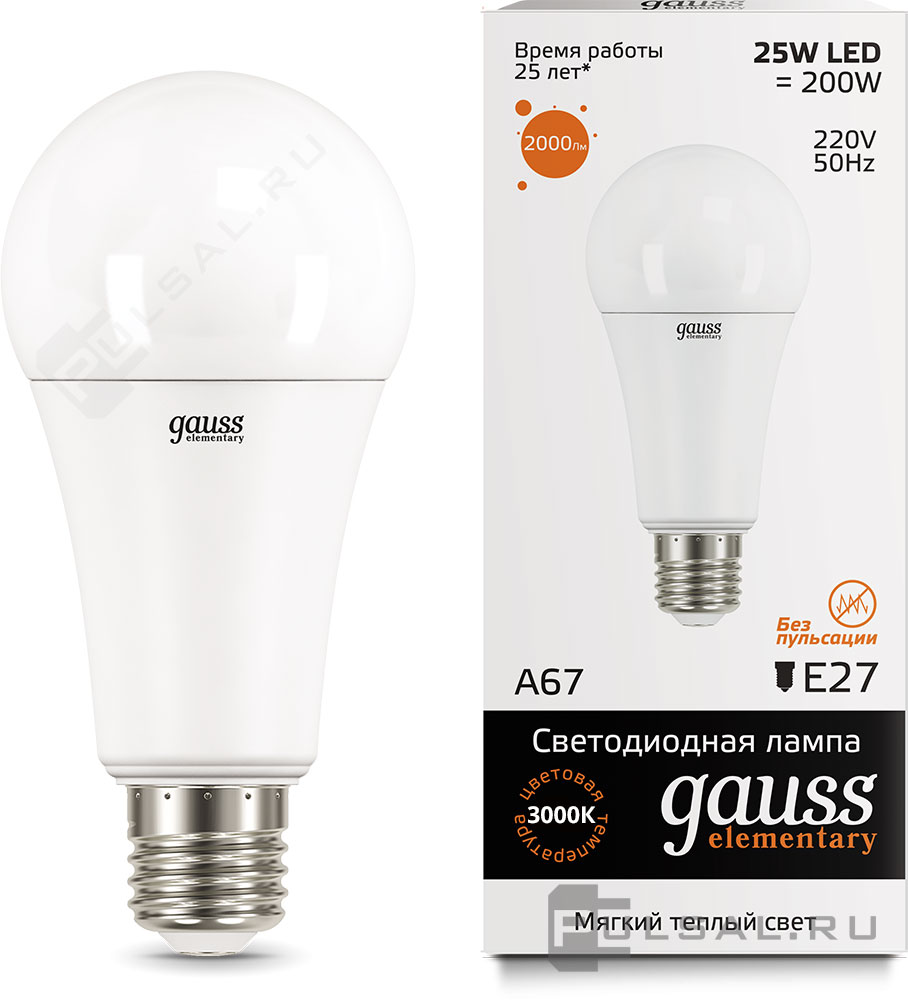 Лампа светодиодная Elementary, цоколь - E27, мощность - 25Вт, световой поток - 2000Лм, цветовая температура - 3000К, не диммируется, 73215, Gauss