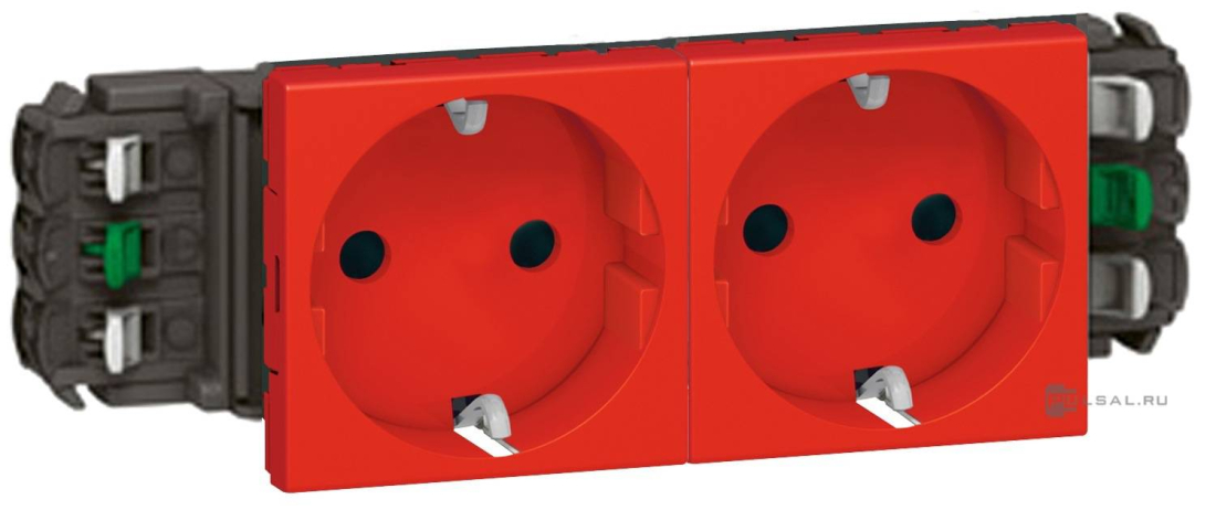 Розетка с механической блокировкой Mosaic, со шторками, с заземлением, двойная, безвинтовые клеммы, цвет - красный