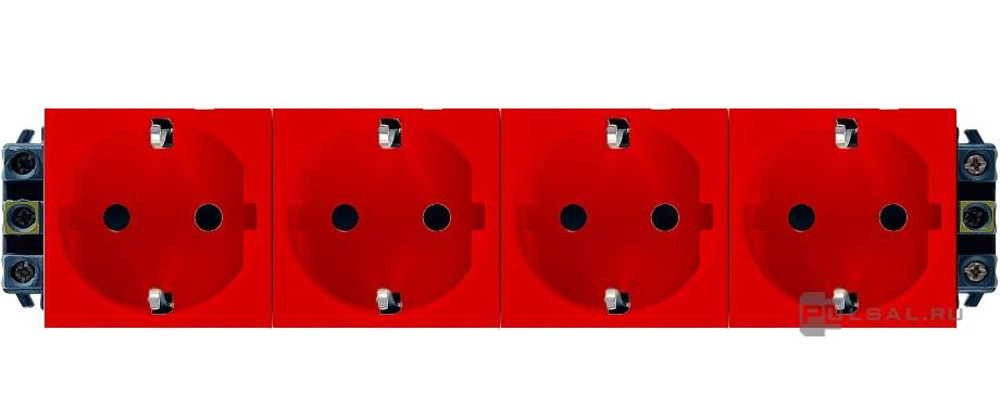 Розетка Mosaic, без шторок, с заземлением, четверная, безвинтовые клеммы, цвет - красный