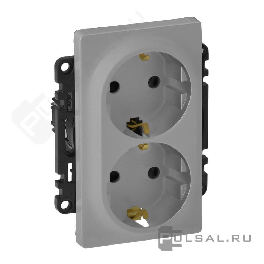 Розетка Valena Life, без шторок, с заземлением, двойная, безвинтовые клеммы, цвет - алюминий