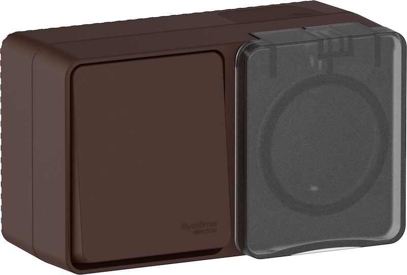 Блок, розетка + выключатель Atlas Design Profi 54, со шторками, с крышкой, с заземлением, одинарная, винтовые клеммы, цвет - коричневый