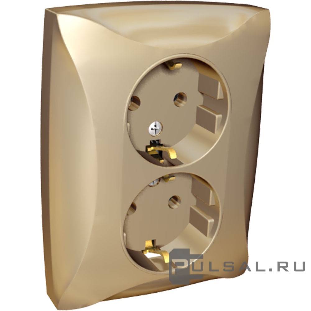 Розетка Дуэт, без шторок, с заземлением, двойная, винтовые клеммы, цвет - шампань