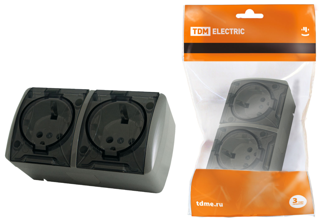 Розетка Селигер, с крышкой, с заземлением, двойная, винтовые клеммы, цвет - серый