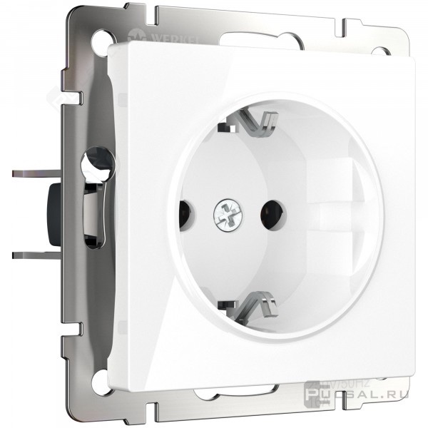 Розетка Alumax, Split, Slab, Senso, Baguette, Acrylic, Platinum, Elite, Snabb, Stream, Flock, Stark, Fiore, Favorit, Diamant, Aluminium, Antik, Metallic, без шторок, с заземлением, одинарная, безвинтовые клеммы, цвет - белый