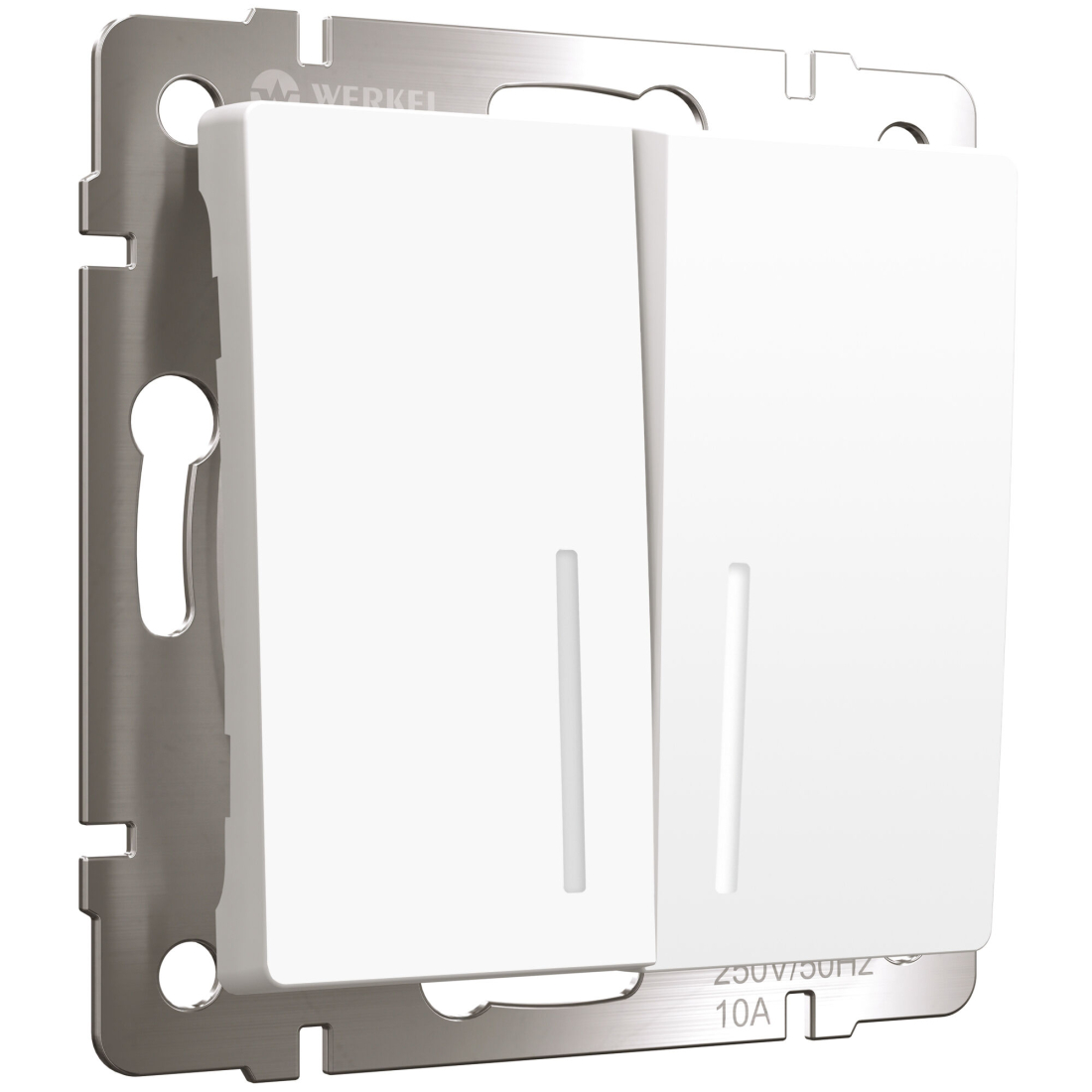 Переключатель Alumax, Split, Slab, Senso, Baguette, Acrylic, Platinum, Elite, Snabb, Stream, Flock, Stark, Fiore, Favorit, Diamant, Aluminium, Antik, Metallic, двухклавишный, с подсветкой, цвет - белый матовый