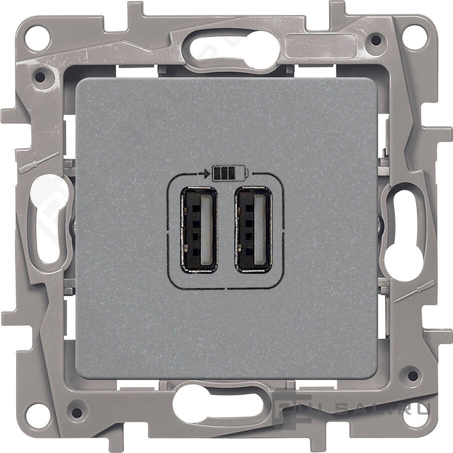Розетка USB, 2.4А Etika, USB type-A 5V, двойная, цвет - алюминий