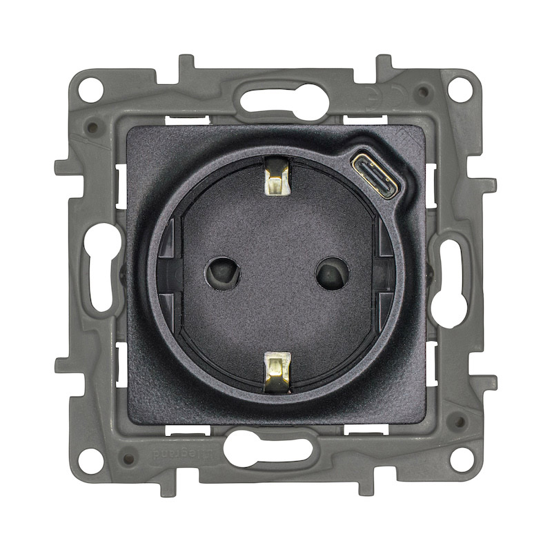 Электрическая розетка с USB type-C, 1,5A, 7,5Вт Etika, USB type-C 5V, Электр. с USB, одинарная, цвет - антрацит